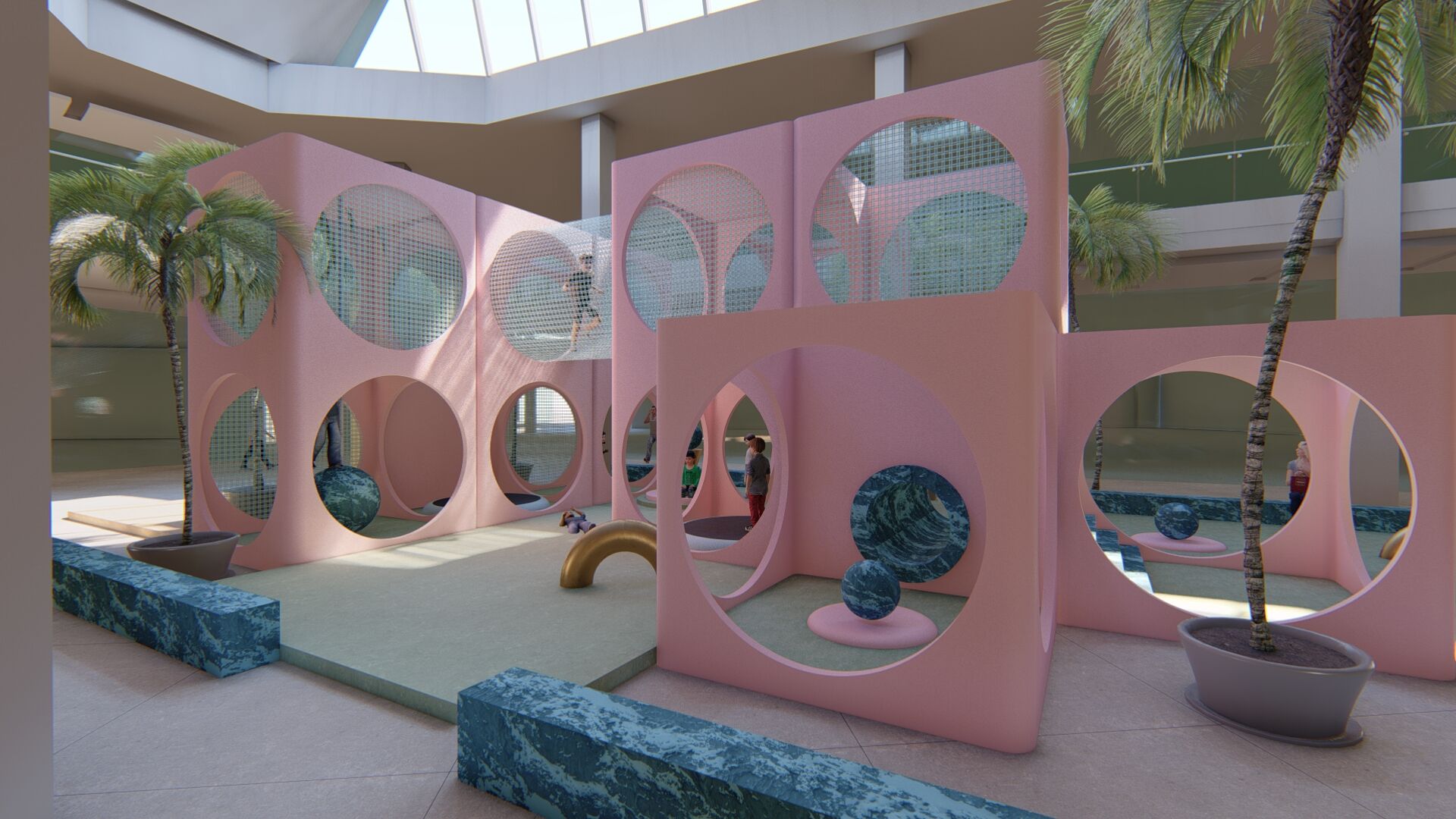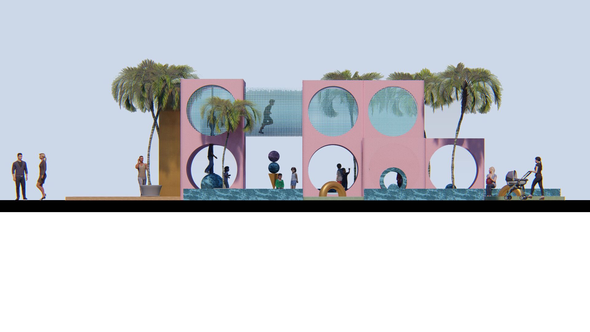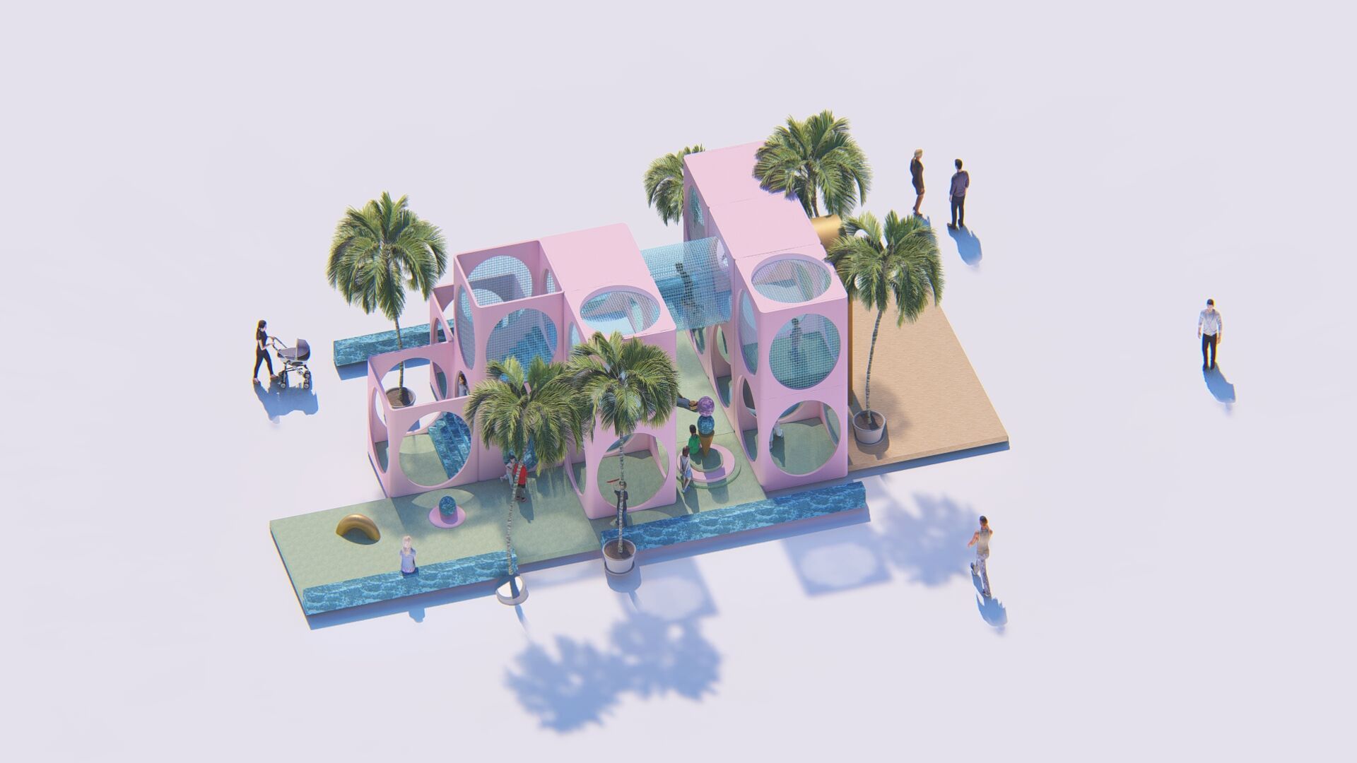 Closely related to ‘Populuxe’ and ‘Mid-Century Modern’ architecture, historically vilified and only recently vindicated, ‘Dingbat’ architecture is a uniquely Los Angeles vernacular. This concept aims to reinterpret the classic form and function of the dingbat style into a glamorous, modern, and fun playscape.