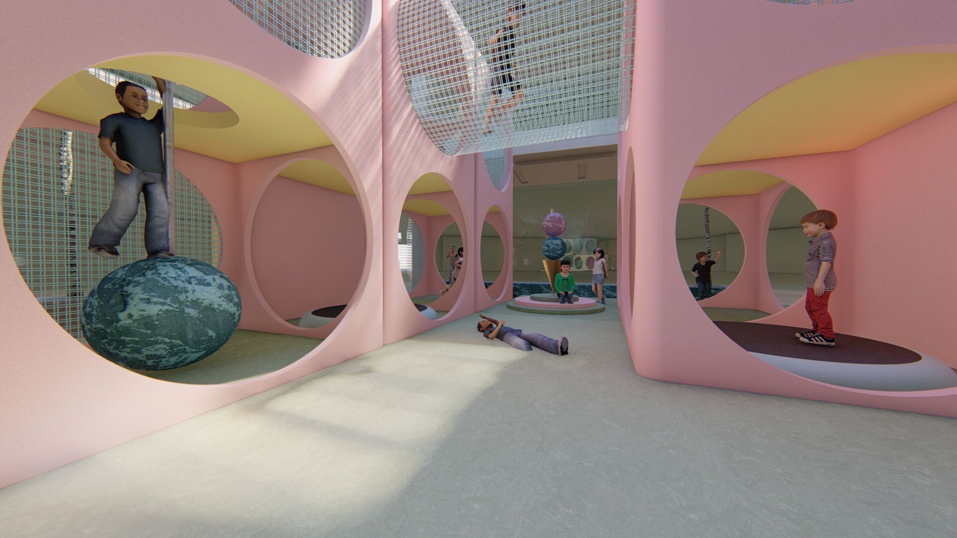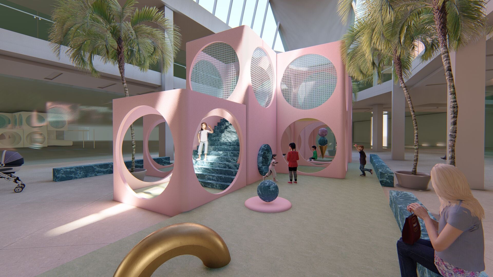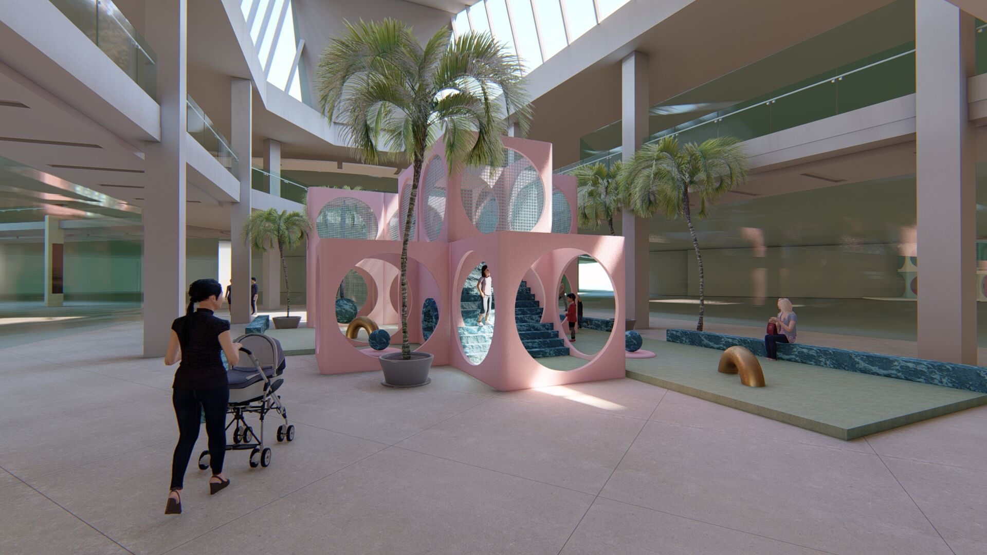 Closely related to ‘Populuxe’ and ‘Mid-Century Modern’ architecture, historically vilified and only recently vindicated, ‘Dingbat’ architecture is a uniquely Los Angeles vernacular. This concept aims to reinterpret the classic form and function of the dingbat style into a glamorous, modern, and fun playscape.